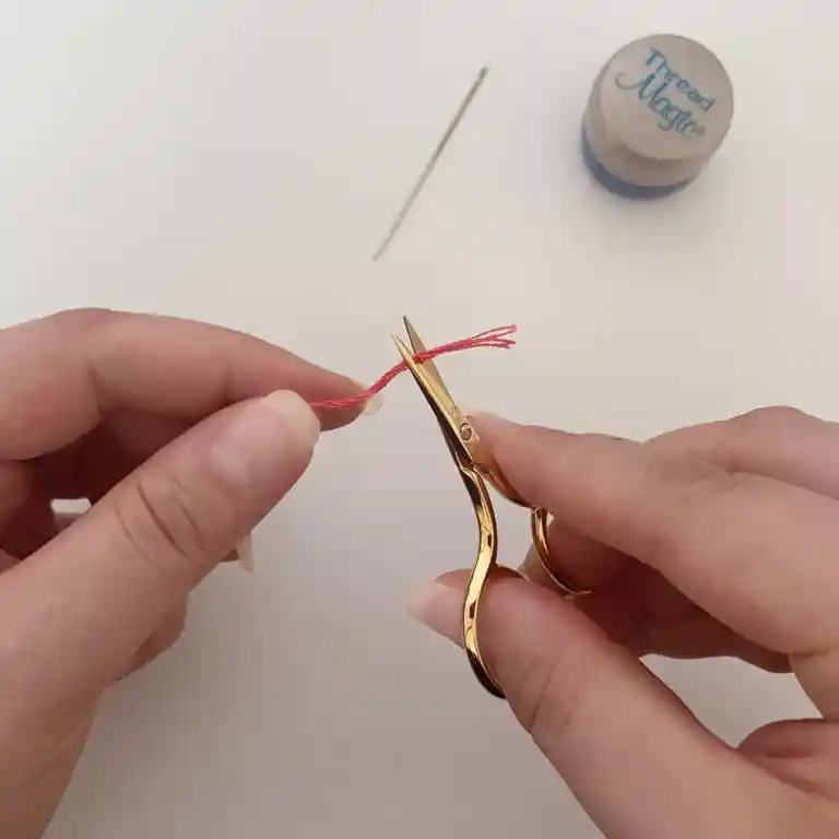 If your thread is a bit frayed, you can dampen the end by wetting it slightly with water or by pinching it between your fingers. This will flatten the fibers for easier threading.