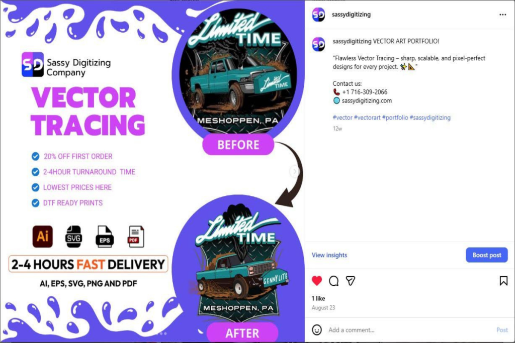 Our vector art division ensures that every design you send is transformed into clean, scalable artwork for any type of printing or production process. From logo tracing to poster designs, we handle it all with precision.